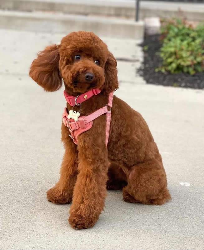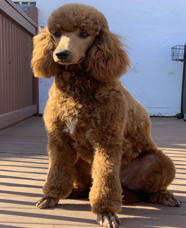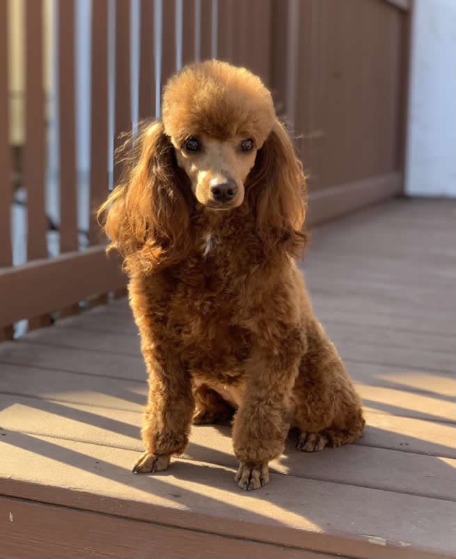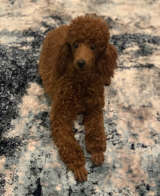 Zora is our beautiful, champion sired red moyen girl. She is sweet-tempered, intelligent and confident. She is the perfect exercise buddy and is always ready for a game of fetch. Zora has a full health panel with Embark Genetics and has passed her DNA and OFA health testing for heart, hips, elbows and patellas. Zora has also had his PennHIP test completed. She is the 3rd generation of true moyen to moyen breedings. We are excited to see the beautiful puppies Zora will produce here at TK Poodles.